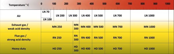 اتصالات پارچهای شرکت LBH دانمارک بر حسب میزان خورندگی سیال عبوری در چهار گروه اصلی به شرح زیر تقسیم گردیدهاند. همچنین با توجه به دمای سیال عبوری تا دمای 1000°C تعداد 26 مدل استاندارد طراحی و ارائه گردیده است: